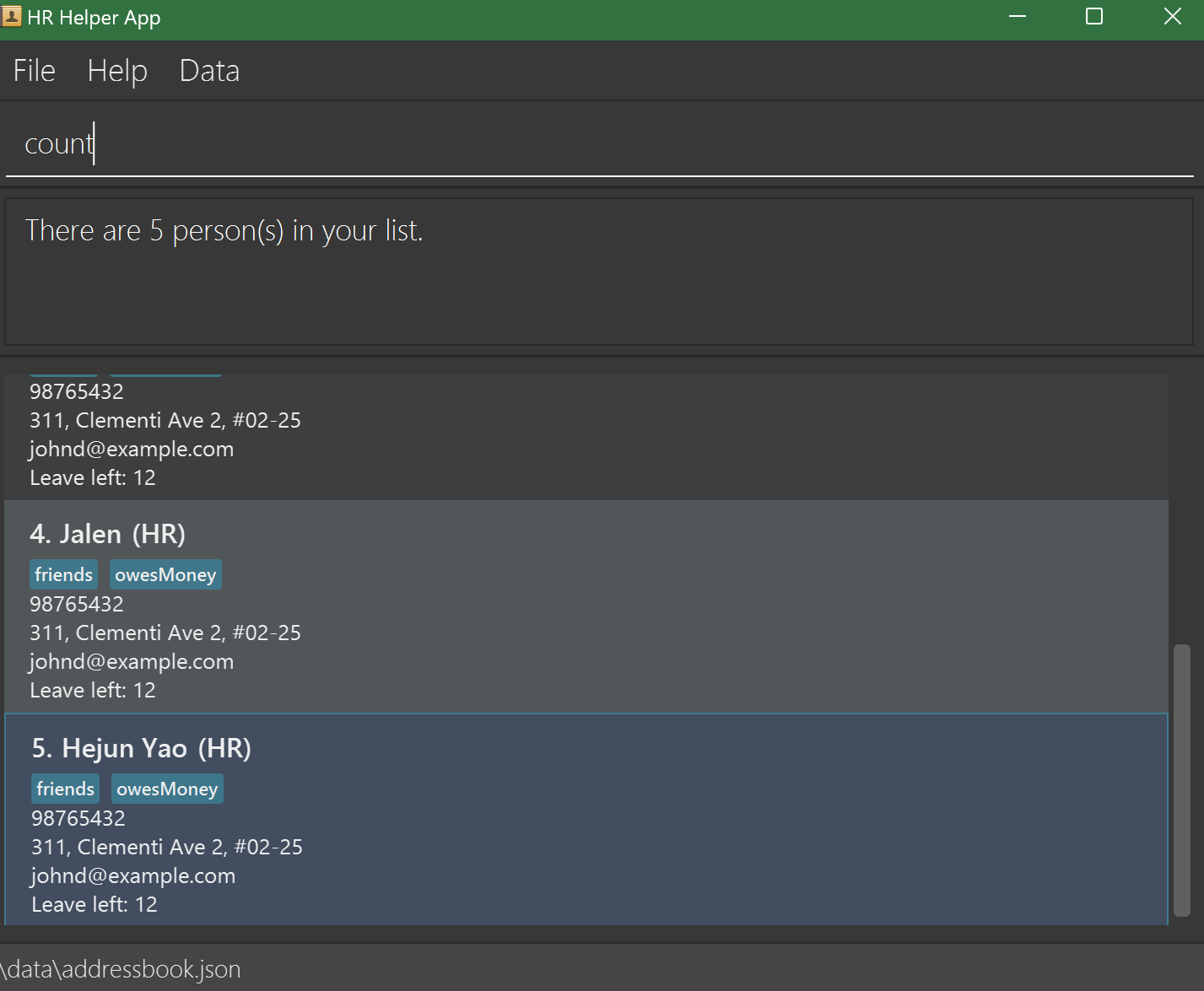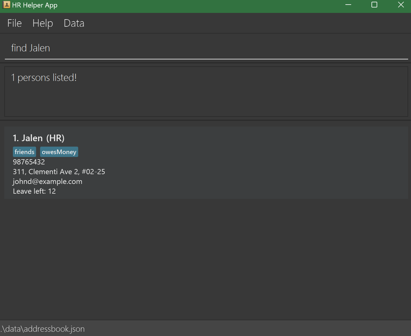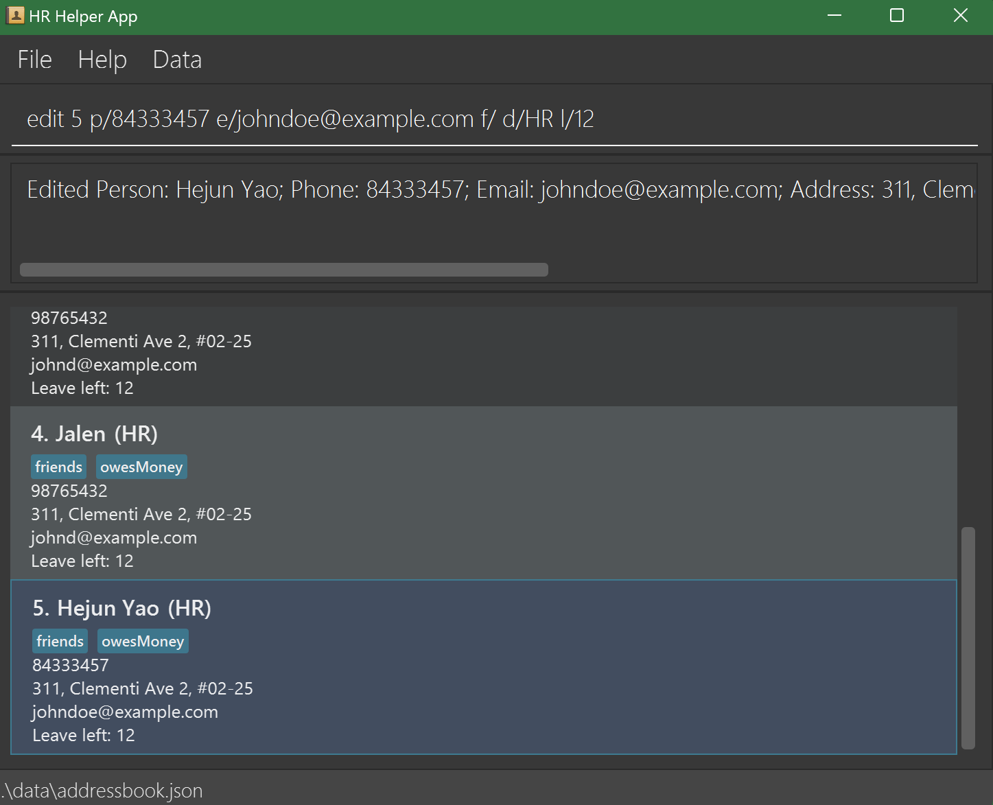 HR Helper data are saved automatically as a JSON file [JAR file location]/data/addressbook.json. Advanced users are welcome to update data directly by editing that data file.