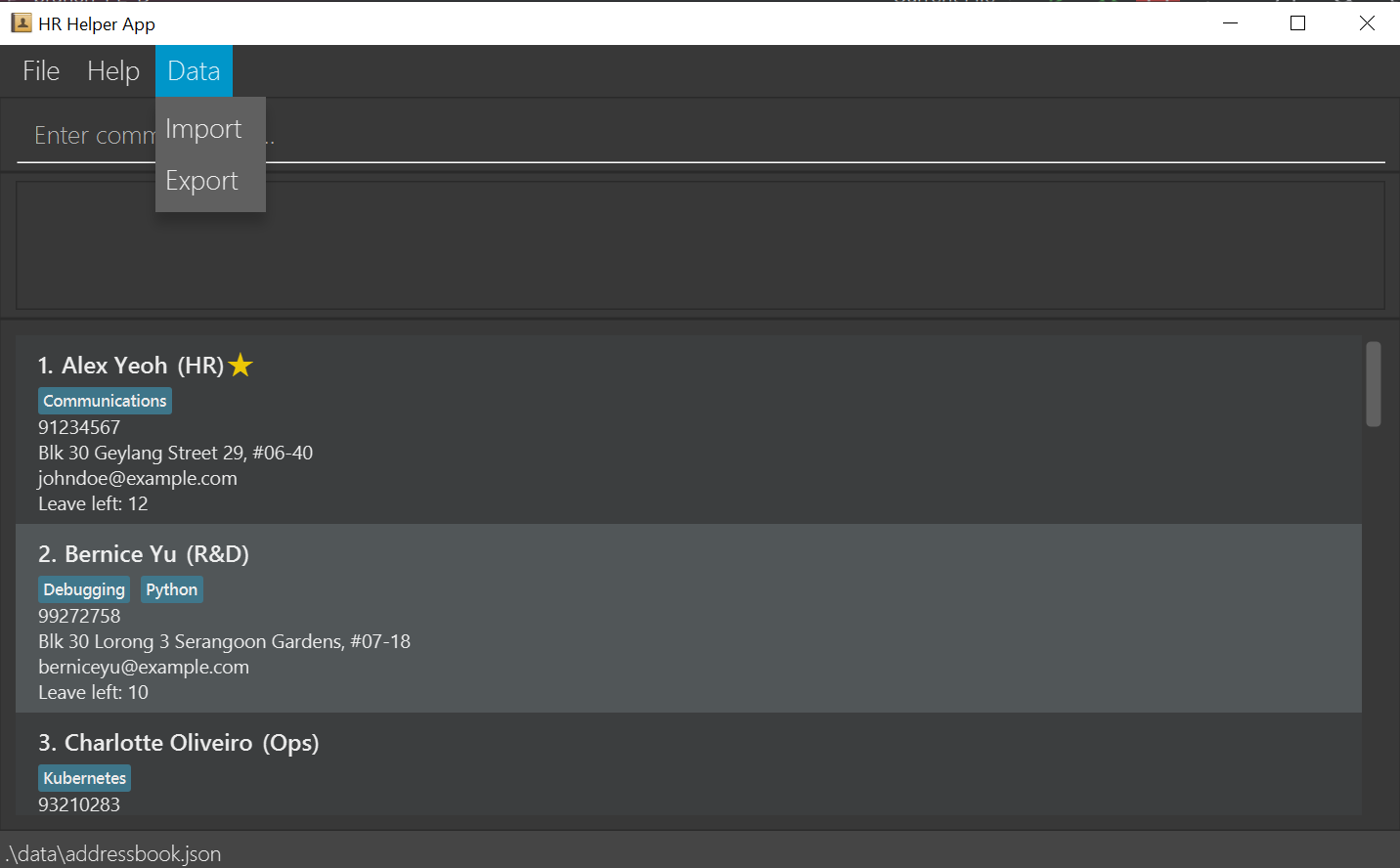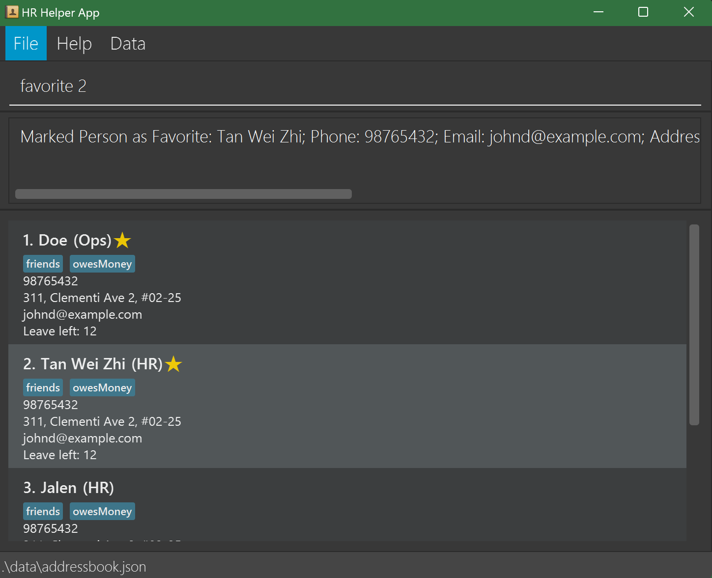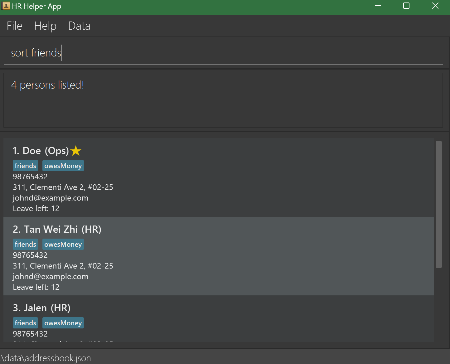 HR Helper data are saved automatically as a JSON file [JAR file location]/data/addressbook.json. Advanced users are welcome to update data directly by editing that data file.