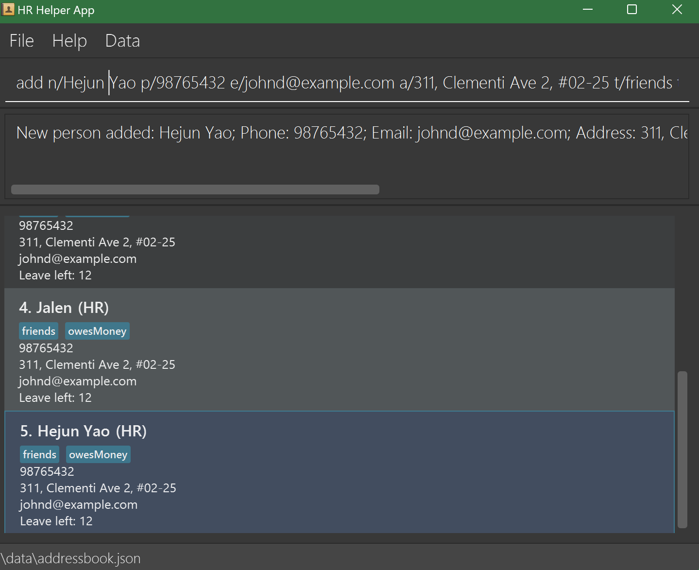 add n/John Doe p/98765432 e/johnd@example.com a/311, Clementi Ave 2, #02-25 t/friends t/owesMoney f/ d/HR l/12 1 : Adds an employee named John Doe to the HR Helper list.