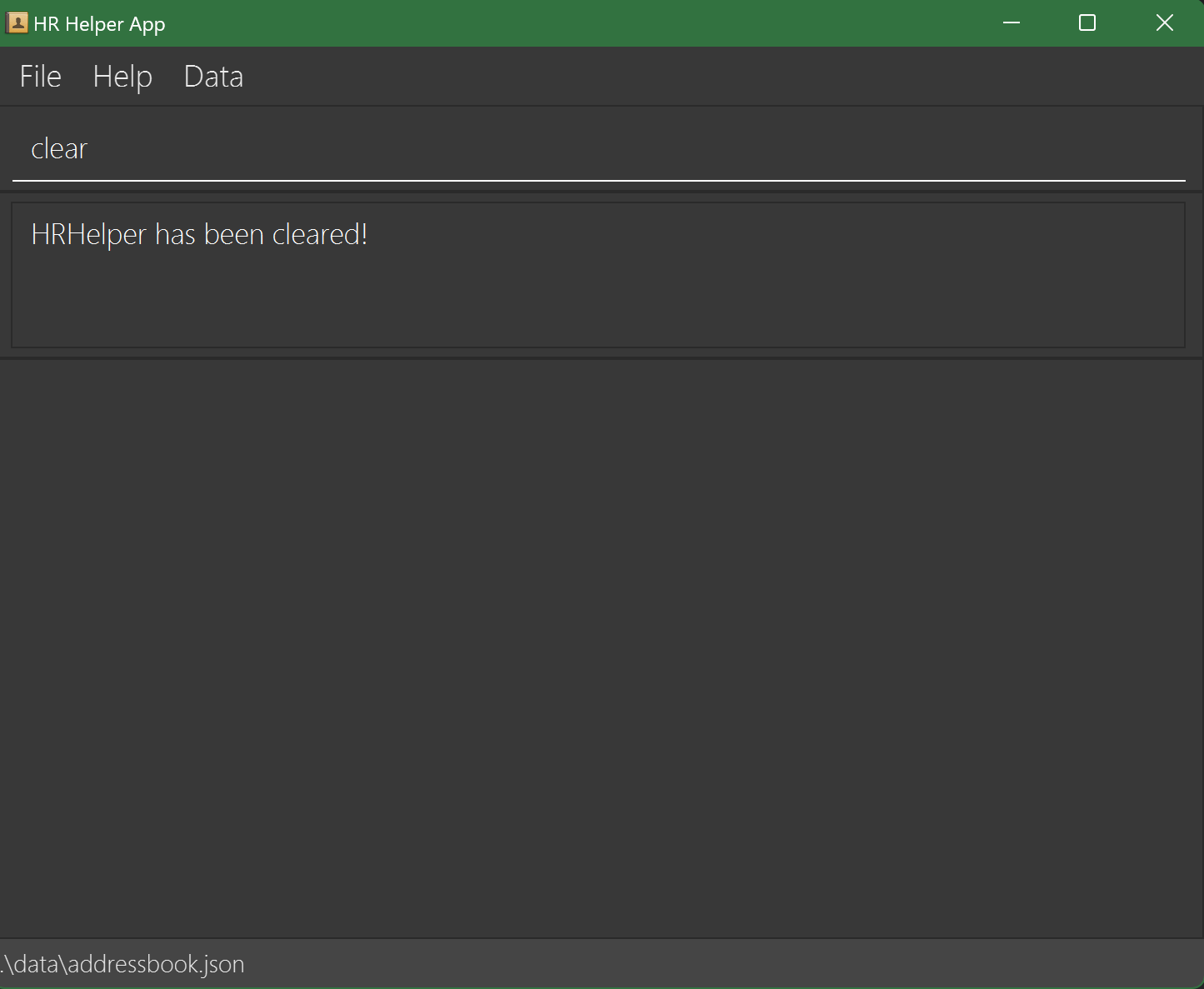clear resets the database in HR Helper.Warning: This action is irreversible. Back up data if necessary before clearing.
